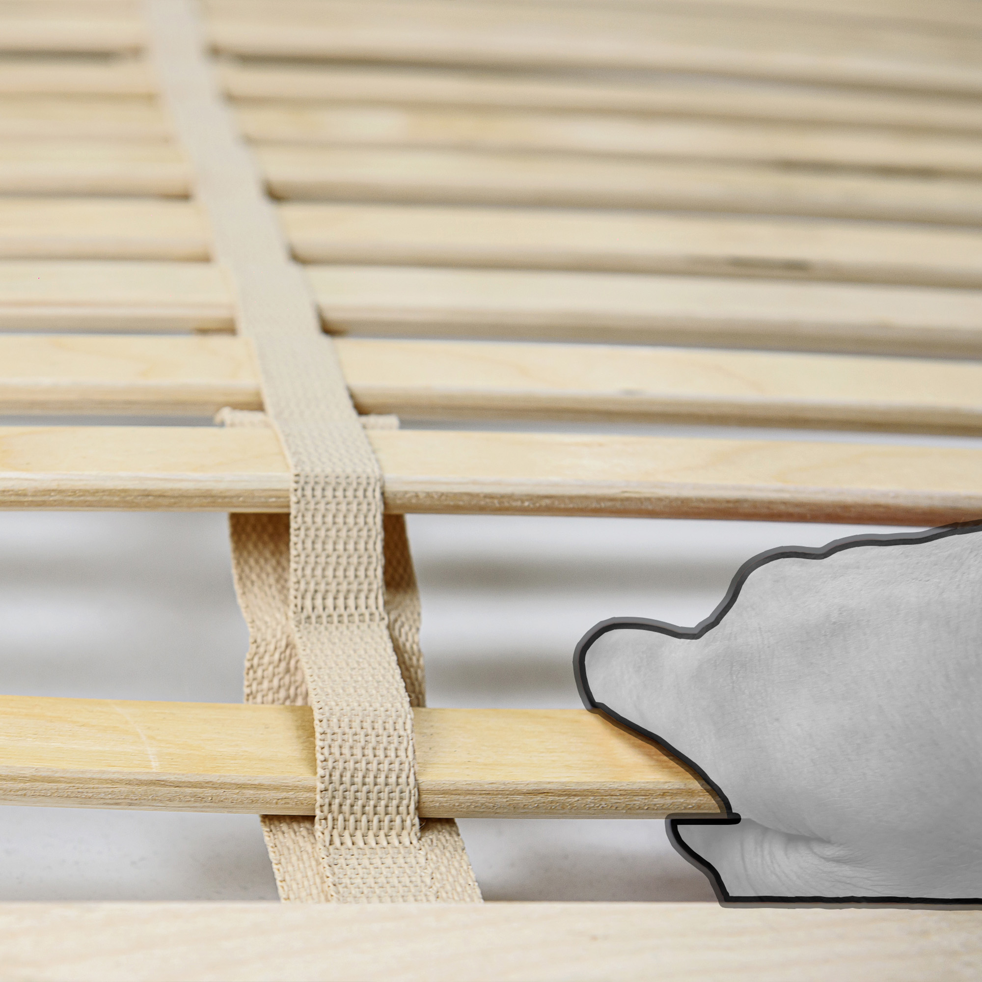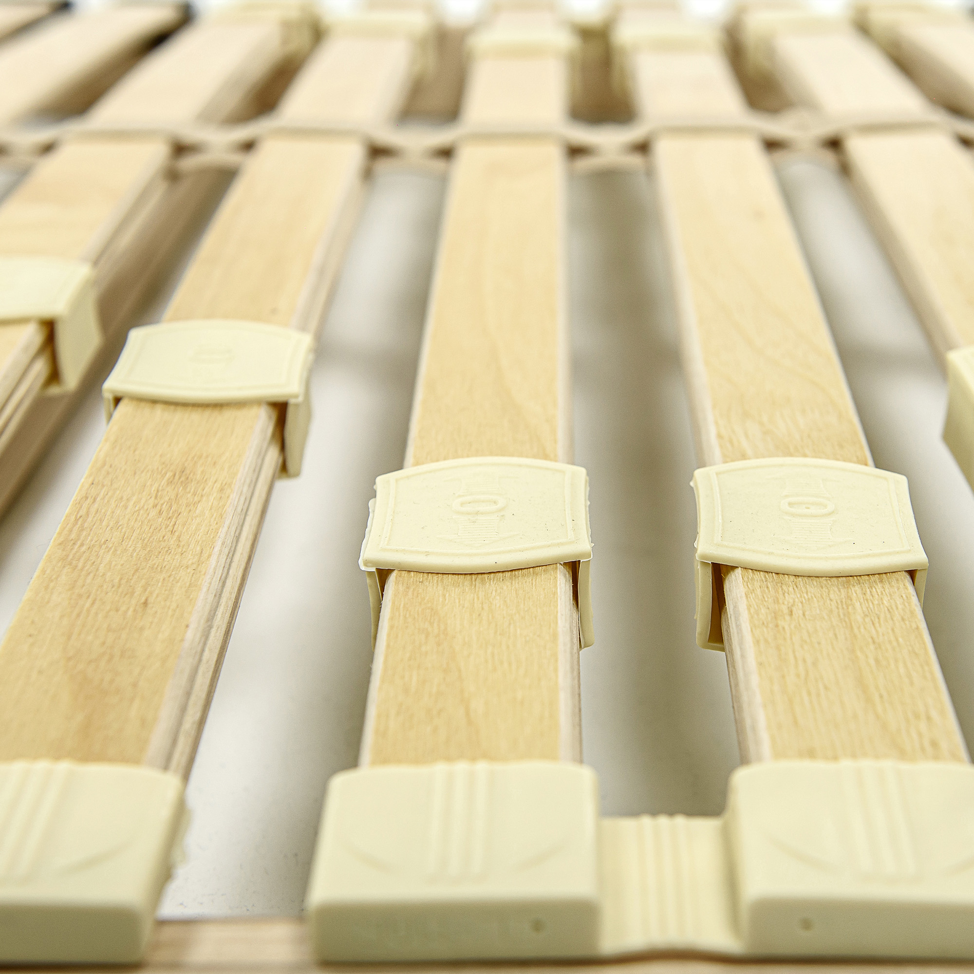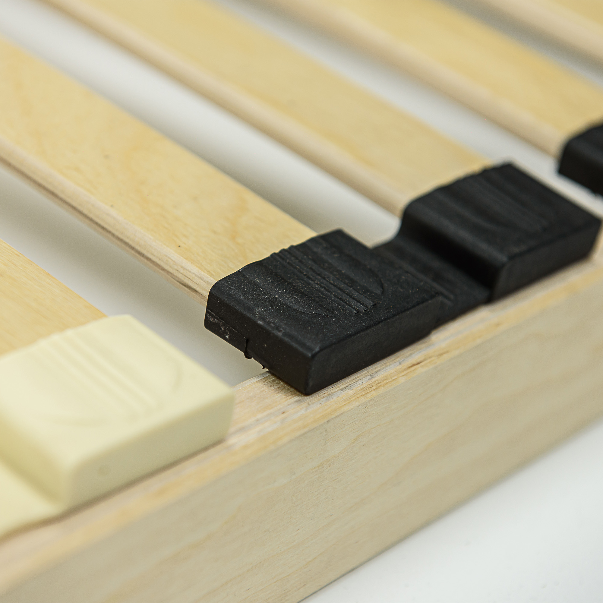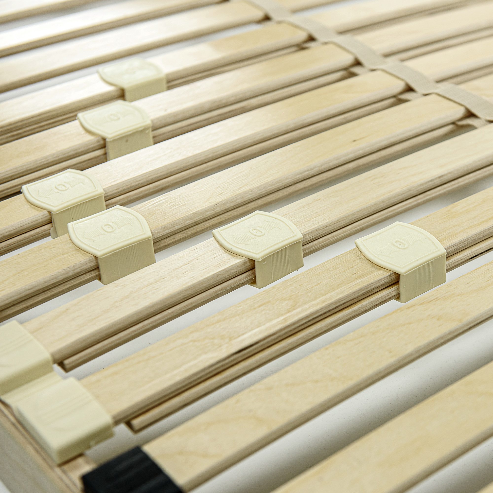 Stelaż ramowy Profi-Frame High to sprawdzona konstrukcja wykonana z warstwowo klejonego drewna liściastego, która gwarantuje wysoką wytrzymałość i stabilność konstrukcji. Podstawę stelaża stanowi 28 brzozowych listew sprężynujących, zamocowanych w wytrzymałych plastikowych uchwytach. Zapewniają one stabilne podparcie i równomierne rozłożenie obciążenia na całej powierzchni stelaża. Konstrukcja skutecznie amortyzuje ruchy w miejscach podparcia, jednocześnie zachowując optymalną sztywność w kluczowych strefach, co znacząco podnosi komfort snu i minimalizuje ryzyko odkształceń materaca.